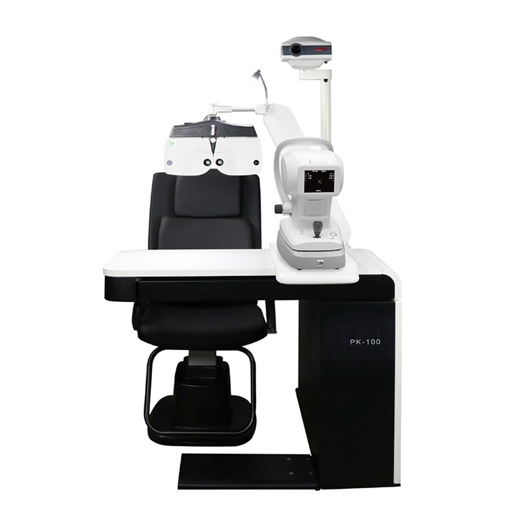 PK-100 Ophthalmic unit Parameters: Unit size: 1030×830×1860mm Table top Size: 1030×500X130mm Small tray Table top Size 300x400mm Drawer inner size 545x370x50mm Movement of small table top 60~460mm, range: 400mm Arm up and down 1430~1730mm, range: 300mm Size of chair 680x590x1345mm Chair up and down 1195~1345mm, range: 150mm Power of light 15W Electric Voltage AC220V/110V 50/60HZ Package size and Weight 92x50x105cm, 110kgs 115x61x27cm, 38kgs 82x63x69cm, 43kgs